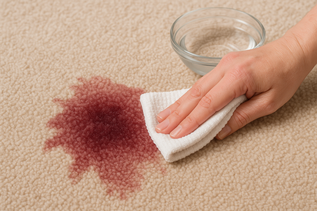 - Wine/juice stains: Blot with paper towel, then use a mixture of white vinegar and water (1:1).